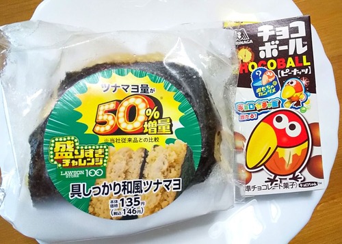 ローソンストア100でも、ローソンと連動した「盛りすぎチャレンジ」開催中。 おにぎりメニューの「盛りすぎ!直巻おにぎり具しっかり和風ツナマヨ···