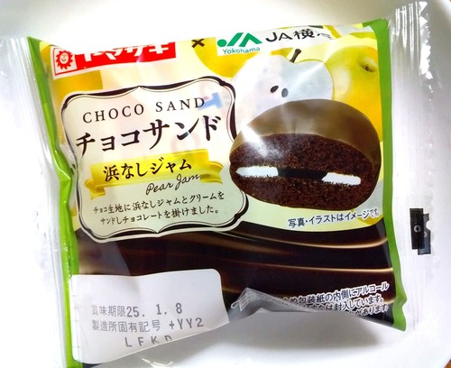 ヤマザキさまとJA横浜のコラボ品「チョコサンド 浜なしジャム」。 チョコ生地に浜なしジャムとクリームを サンドしチョコレートを掛けました。パッ···