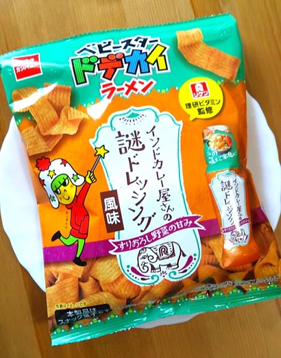 ローソンにて80P使ってお試し引き換え。 ベビースターシリーズの新作「ドデカイラーメン 謎ドレッシング風味」(・∀・) 理研ビタミン監修の『インド···