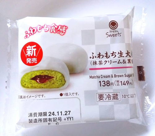 ファミマデザートの新作「ふわもち生大福(抹茶クリーム&黒蜜)」。 「ネオ和菓子」という謳い文句に誘われて(・∀・) とろ~り大福生地に抹茶ホイッ···